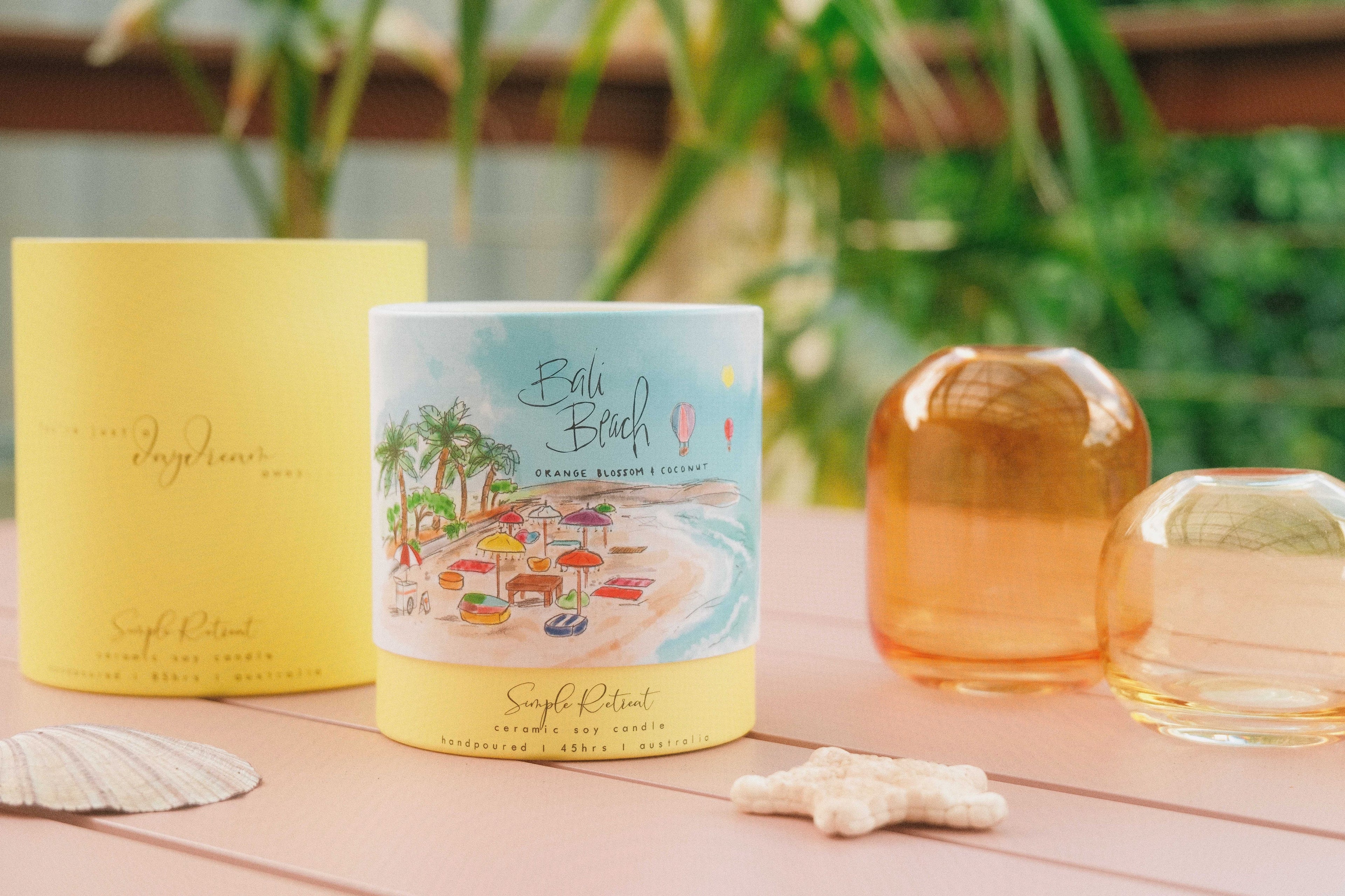 I hand-pour small-batch soy candles into custom ceramic jars, using 100% soy wax and cotton wicks for a clean, minimalist burn. There are nine fragrances across two signature collections - one inspired by travel, the other by the comforts of home - all wrapped in vibrant packaging designed to let your mind wander, even briefly.